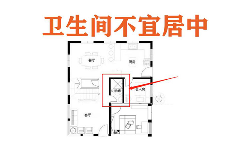 4. 最后卫生间不宜设在住房的中心,住宅的中心属土,厕所属水,水土相克会导致家庭出现灾祸,而且把卫生间安装在住宅的中间,隐蔽工程或后期维修工作也不方便。